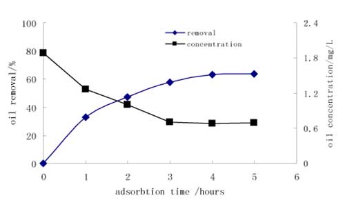 吸附效率在第一個小時內(nèi)迅速增加,三小時吸附后趨于穩(wěn)定,最大除油率為71%。三小時后沒有出現(xiàn)明顯的除油增加,相反,由于解吸過程出現(xiàn)少量的油濃度增加。結果,活性炭的最佳吸附時間是三小時。