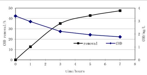 圖4給出了COD去除率和濃度隨吸附時間的曲線。根據(jù)實驗結果,初始3小時吸附后COD濃度由3.39 mg / L降至2.2 mg / L,相當于去除率的35.1%。隨后趨于穩(wěn)定,最低值為1.78 mg / L,最高去除率為47.5%。