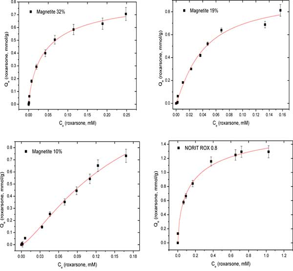 在合成磁鐵礦(Mag-P),商用磁鐵礦(Mag-C),具有可變磁鐵礦(32%,19%和10%; w / w%)的活性炭-磁鐵礦復合物的洛克沙胂等溫條件下吸著吸收結果針鐵礦如圖1和表1所示。利用活性炭實現了羅克沙星的最大單層吸附容量(Q m = 1.783mmol / g)。盡管活性炭含有較低的Fe含量作為雜質,因此其吸附去除羅克沙星主要歸因于非共價相互作用,例如羅克沙酮的苯環與活性炭的石墨烯表面之間的π-π堆積和氫鍵。在復合材料(CM-10,-19和-32)的情況下,隨著活性炭含量的增加,羅克沙星的Q m值增加,正如對疏水效應影響的吸附過程所預期的那樣。相反,鐵氧化物組分,如磁鐵礦,針鐵礦和磁鐵礦的復合材料,其具有的π電子受體(路易斯酸)由于鐵物質的吸附劑表面上存在位點,特別是對于無機砷酸鹽。