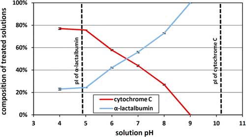 雖然活性炭的大小選擇性使其成為純化較高分子量蛋白質的理想選擇,但是我們好奇它是否也可用于純化較低分子量的蛋白質。如果較低分子量的蛋白質產物和蛋白質雜質具有顯著不同的等電點,這可能是可能的。然后可以在接近蛋白質雜質的等電點的溶液pH下進行選擇性純化,并進一步遠離蛋白質產物的等電點。在此pH下,靜電排斥會降低活性炭對更強電荷蛋白質產物的結合能力,并最大化其對弱電荷蛋白質雜質的結合能力。c和1.0mg / mL的α-乳清蛋白,在靜態結合條件下用活性炭在4.0-9.0的pH下進行。通過分析反相HPLC測定用活性炭處理后保留在溶液中的細胞色素c和α-乳清蛋白的百分比,并將其作為溶液pH的函數作圖(圖1)。