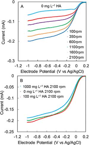 圖2.(A)0mg L -1 活性炭吸附腐殖酸溶液在不同轉(zhuǎn)速下的電流-電位曲線。(B)用0,100和1000mg L -1 活性炭吸附腐殖酸溶液在2100rpm下的電流-電位曲線。