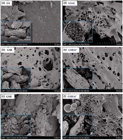 圖1顯示了合成的活性炭及其前體的形態。木質纖維素和水熱材料孔隙度低,表面相當粗糙。這些觀察結果與它們的低S BET和總孔體積相匹配。GSH中的微球在圖1中可見,是由GS在熱液碳化過程中的高纖維素組分形成的。但木質素含量高可能會阻止氫化活性炭樣品中大量碳球的形成。此外,水熱過程中纖維素和木質素的分解較弱,可能是氫化活性炭孔隙發育不良的原因。當木質纖維素材料在高溫下熱解時,生物活性炭的形態可以觀察到顯著的變化。生物活性炭的表面形態示出發達的孔隙和相當高的表面積,并且因此,生物活性炭可以被認為是一個綠色的吸附劑在廢水處理過程中使用。